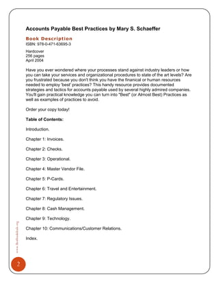 This document provides a summary of the book "Accounts Payable Best Practices" by Mary S. Schaeffer and advertises textbook deals on the website BestBookDeals.org. It outlines how the book describes best practices for accounts payable used by admired companies and examples to avoid. It also encourages the reader to order the book or visit the website for discounts on new and used textbooks of up to 90% and 30% respectively, along with the ability to sell textbooks back for up to 70% of the amount.