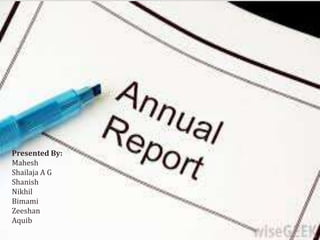 The document discusses the key components of an annual report for a company. It explains that an annual report provides shareholders and other stakeholders a comprehensive overview of the company's financial performance and activities over the preceding year. It then describes the typical sections included in an annual report such as the reports of directors and management, audited financial statements, notes on accounting policies, and segmented reporting. The document also includes examples of balance sheet, cash flow statement, and profit and loss proformas that are commonly included in annual reports.