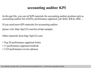 This document discusses key performance indicators (KPIs) for accounting auditors. It provides examples of KPI materials that can be used for accounting auditors, such as lists of KPIs, performance appraisals, job skills, and key result areas. It also outlines steps for creating KPIs for accounting auditors, including defining objectives, identifying key result areas and tasks, and determining how to measure results. Common mistakes to avoid when setting KPIs, such as having too many, are also covered. The document recommends visiting an external website for additional KPI samples and materials.