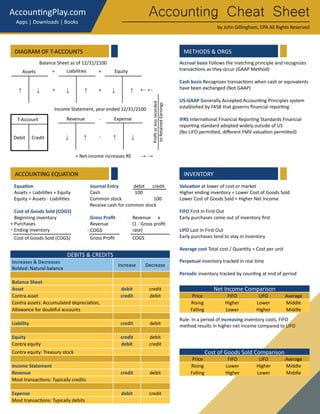 This document provides an accounting cheat sheet that summarizes key accounting concepts, principles, and methods. It covers topics like the accounting equation, debits and credits, financial statements, inventory costing methods, and more. Key terms are defined concisely with examples to help the reader learn essential accounting concepts in a simple and straightforward manner.