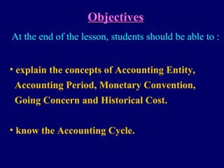 The document introduces key accounting concepts: the accounting entity assumes transactions only related to the business are recorded; the accounting period divides a business's life into fixed time periods like months or years; the monetary convention uses money as the unit of measurement; the going concern assumption considers the business a continuous operation; and the historical cost principle records assets at their original acquisition cost. It then provides examples of basic bookkeeping, recording expenses in categories and preparing a basic income statement to check if records are accurate and money is being managed properly. Finally, it outlines the basic accounting cycle of collecting source documents, recording journal entries, posting to ledgers, preparing a trial balance, making adjustments, and producing financial reports.