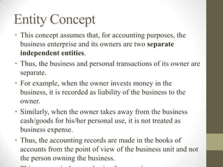 - The entity concept treats a business and its owners as separate entities for accounting purposes. Personal transactions are separate from business transactions.