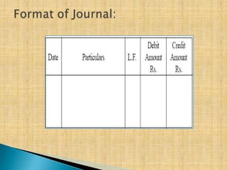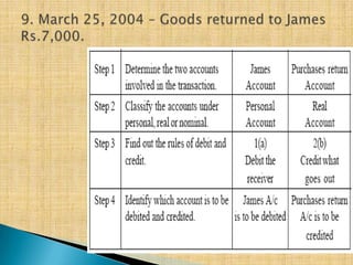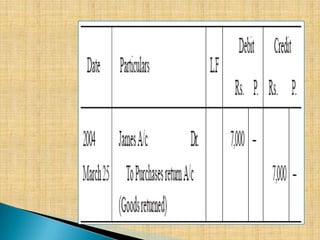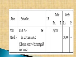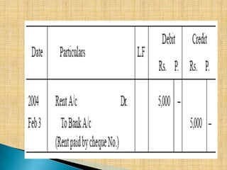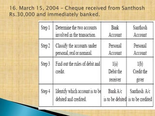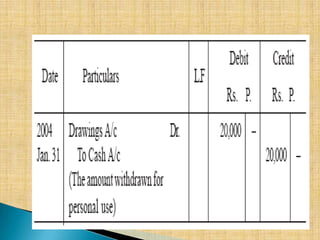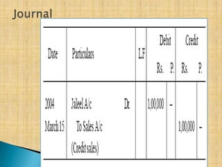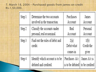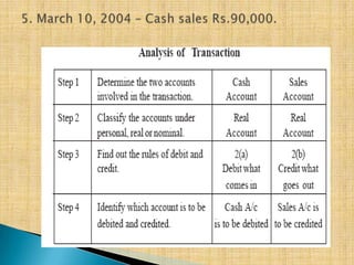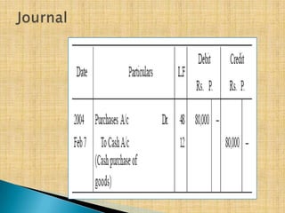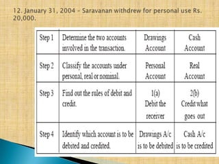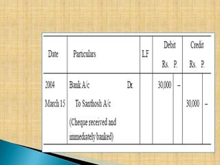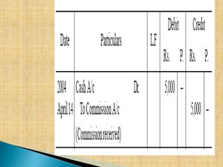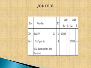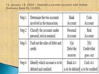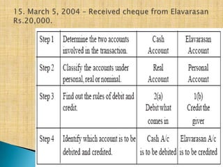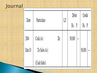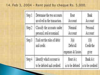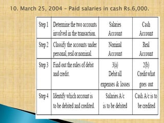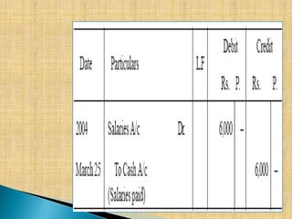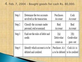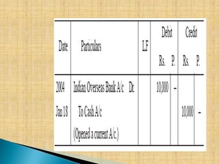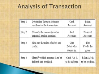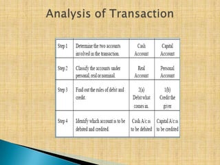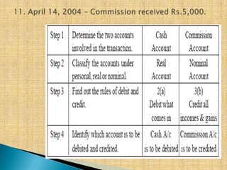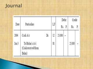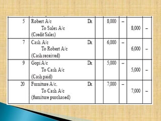 The document discusses the accounting cycle and provides examples of classifying accounts, journalizing transactions, preparing ledger accounts, and posting journal entries to the ledger. It begins by classifying various accounts as personal, real, or nominal. Examples are then provided of journalizing transactions and posting the journal entries to update the appropriate ledger accounts. The key steps in journalizing, preparing ledger accounts, and posting entries from the journal to the ledger are outlined. Compound or combined journal entries involving multiple debits and/or credits are also introduced.