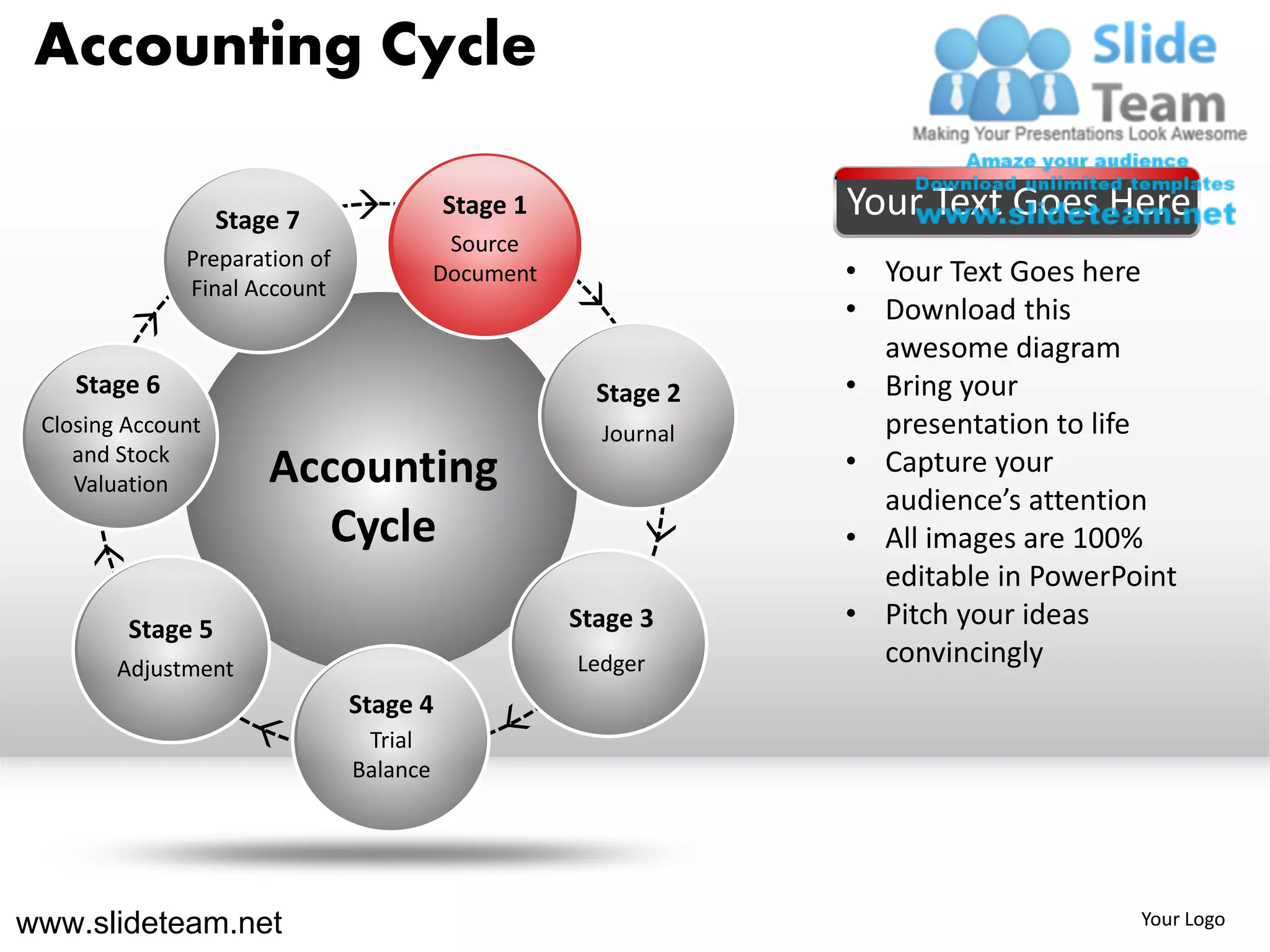 The accounting cycle has 7 stages: (1) journalizing transactions, (2) posting to ledgers, (3) preparing a trial balance, (4) making adjustments, (5) closing accounts and preparing financial statements, (6) preparing a post-closing trial balance, and (7) preparing final reports.