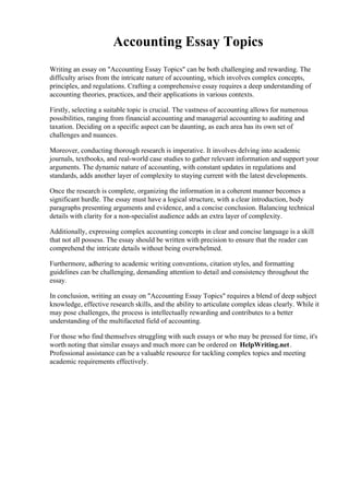 Writing an accounting essay requires deep subject knowledge, thorough research skills, and the ability to clearly articulate complex concepts. Selecting a suitable topic from the vast field of accounting is challenging. Research must include academic sources and real-world case studies to support arguments. Effectively organizing information into a logical structure with introduction, body, and conclusion can be difficult. Expressing technical accounting details with clarity for non-specialists adds further complexity. Adhering to academic writing standards also demands attention to detail. While accounting essays pose challenges, the process contributes to a better understanding of this multifaceted field.