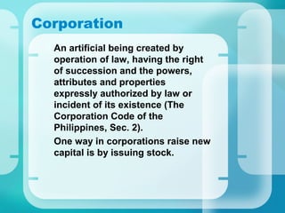 Corporations raise capital by issuing stock. Equity financing through stock issuance is less risky than debt financing through bonds. When profits are not paid out as dividends, the cash can be reinvested in expanding operations. A corporation is a legal entity separate from its shareholders, with unlimited life, transferable shares, and limited liability for shareholders. Key components include incorporators, shareholders, directors, and officers.