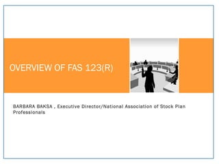 This document provides an overview of FAS 123(R), emphasizing the accounting and reporting of equity compensation for employees and non-employees, detailing how stock options, restricted stock, and other forms of compensation are measured and expensed. It offers specific examples, including the use of the Black-Scholes model for option valuation and the importance of tracking forfeiture rates for accurate expense recognition. Additionally, it discusses best practices for managing these calculations, including the use of equity management systems to streamline processes and improve data accuracy.