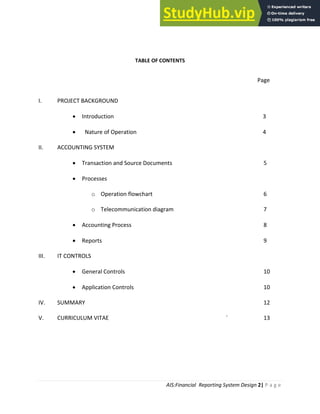 This document describes the design of a financial reporting system for a wireless telecommunications company in the Philippines. It includes details on the company's operations, accounting processes, reports, and controls. The telecom derives income from postpaid plans, prepaid subscriptions, and internet connections. It also generates revenue from selling SIM cards and modems. Transaction records are stored electronically. The financial reporting system involves updating the general ledger, posting adjustments, preparing financial statements, and generating managerial reports. It includes both general controls over IT resources and application controls to ensure accurate financial reporting.
