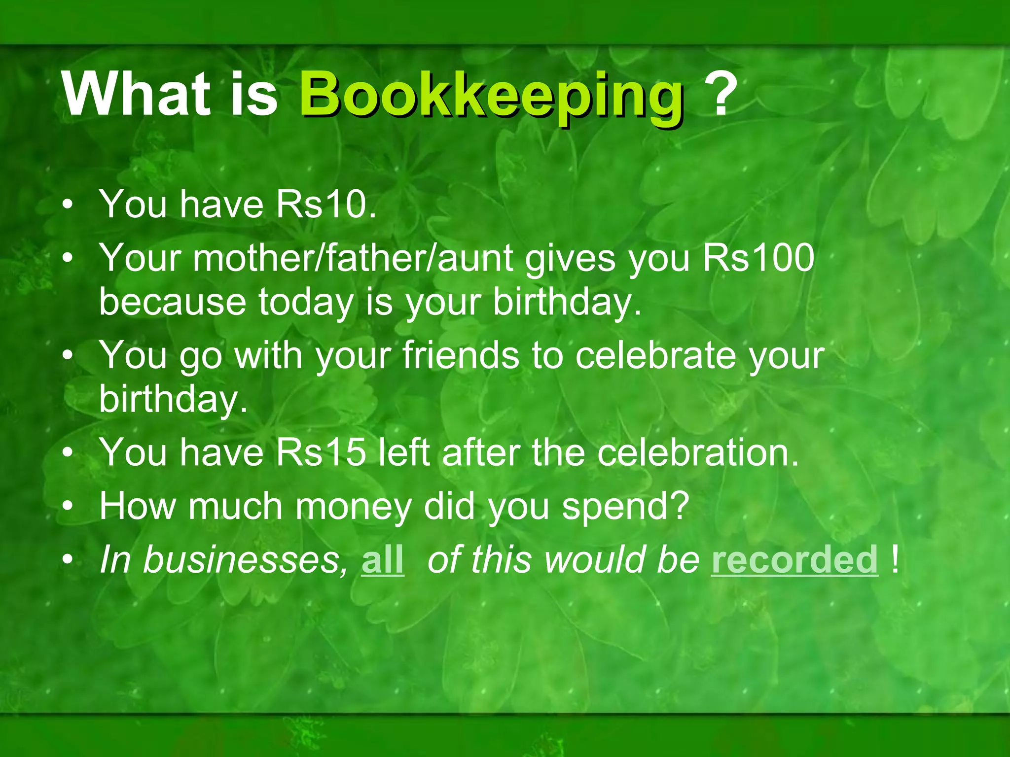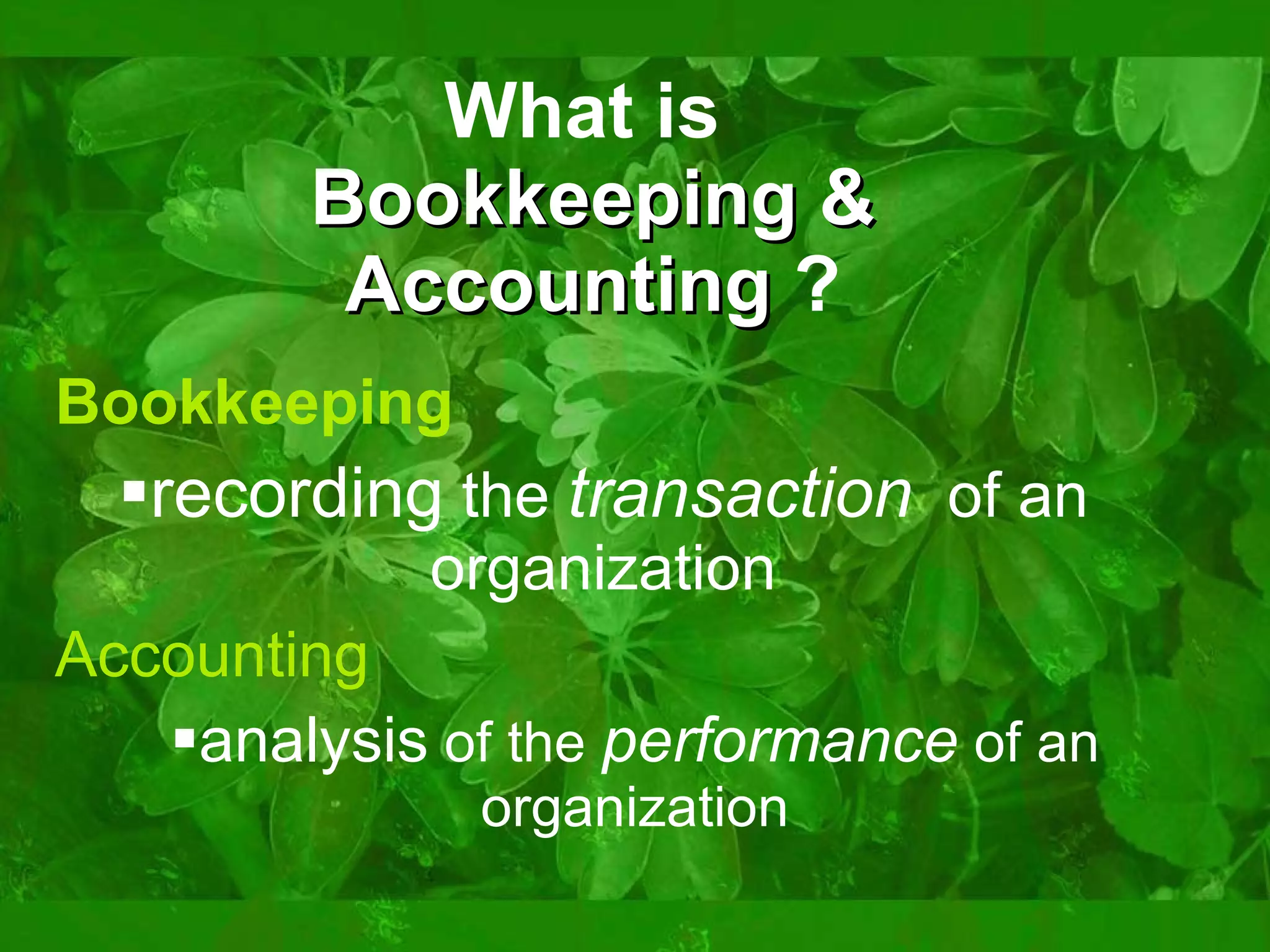 Bookkeeping involves routinely recording business transactions, while accounting analyzes a business's financial performance and position. Bookkeeping keeps track of money in and out, like a person's birthday money. Accounting examines the impact of transactions through financial statements. Both require documenting proof of transactions for accuracy and to prevent fraud. Accounting has various types including financial, cost, and management accounting that serve different purposes like external reporting, cost analysis, and internal decision making.