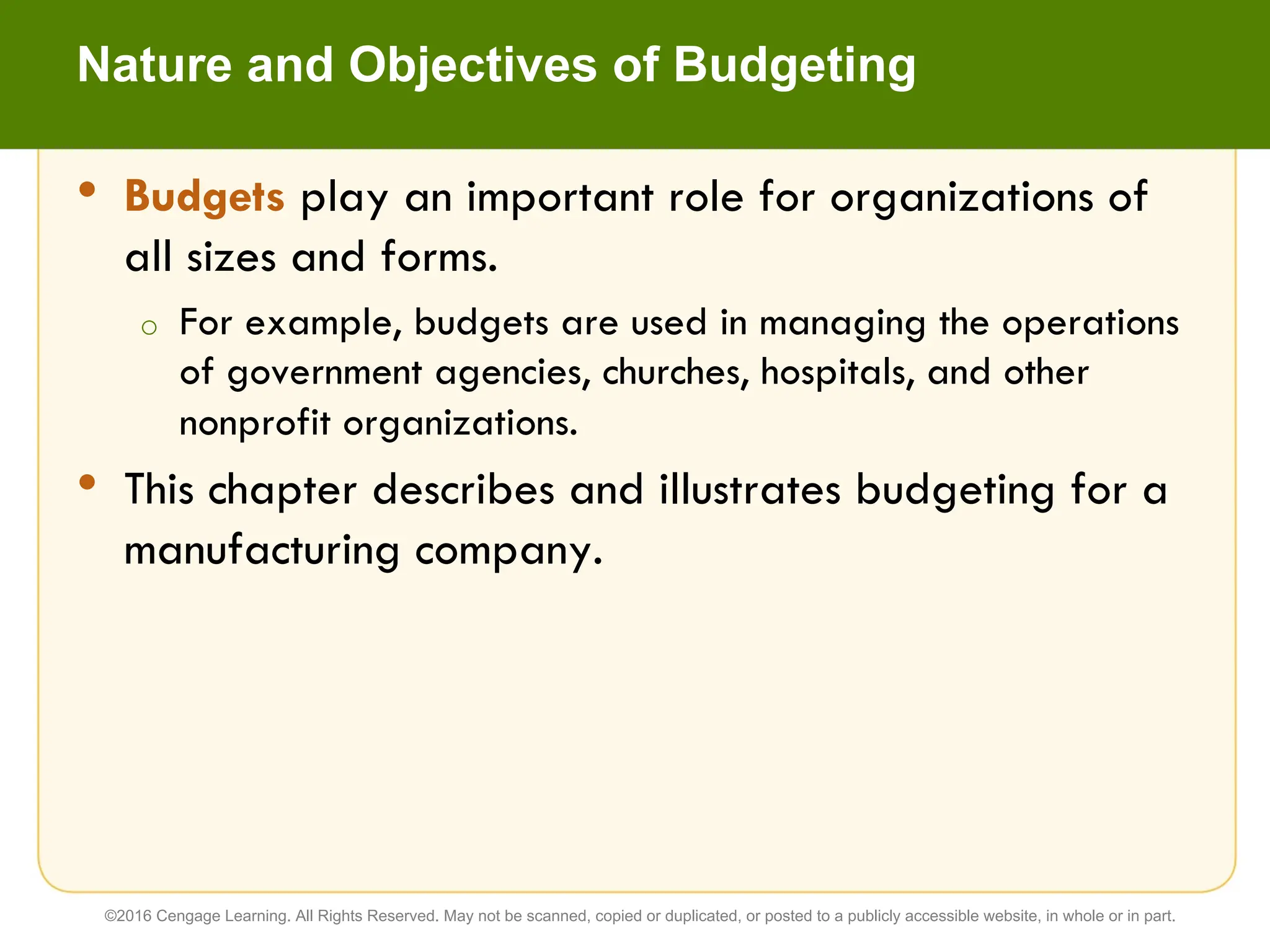 Budgeting plays an important role for organizations of all sizes. This chapter describes budgeting for a manufacturing company, including how budgets affect planning, directing, and controlling. Budgets can involve setting goals, comparing actual performance to goals, and addressing human behavior issues like setting goals too tight or loose. The chapter outlines different budgeting systems including static, flexible, and master budgets which integrate operating and financial budgets.