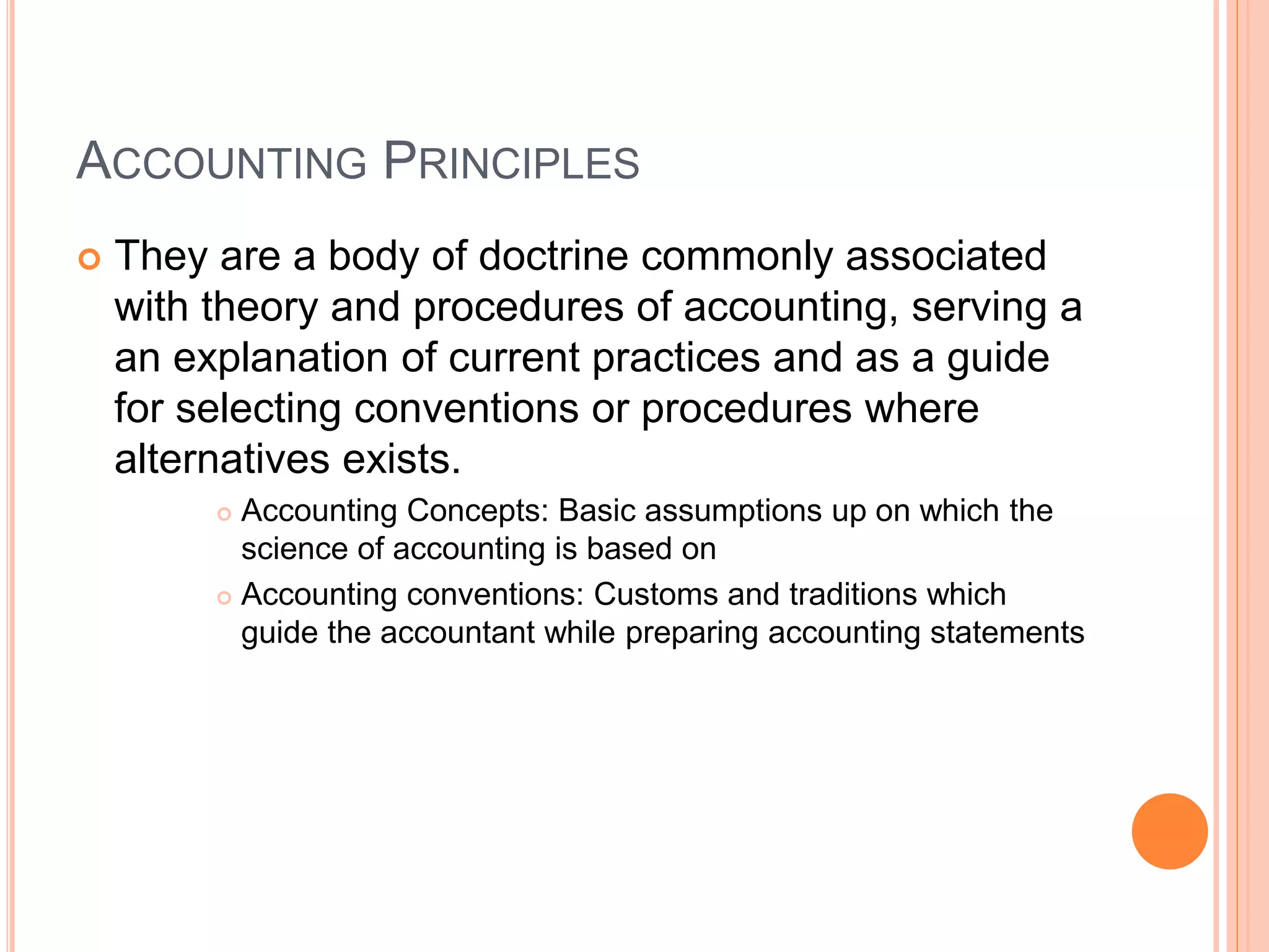 ACCOUNTING PRINCIPLES They are a body of doctrine commonly associated with theory and procedures of accounting, serving a an explanation of current practices and as a guide for selecting conventions or procedures where alternatives exists.  Accounting Concepts: Basic assumptions up on which the science of accounting is based on  Accounting conventions: Customs and traditions which guide the accountant while preparing accounting statements