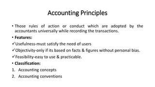 - Accounting principles are the rules and guidelines that accountants follow when recording transactions, including usefulness, objectivity, and feasibility.