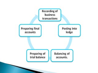 The document outlines the accounting process, also known as the accounting cycle, which consists of a series of steps beginning with the identification and analysis of business transactions and concluding with the preparation of financial statements. It details the stages of recording transactions in journals, posting to ledgers, balancing accounts, and preparing a trial balance, which serves as a basis for the final financial statements including the trading, profit and loss account, and balance sheet. This process ensures accurate financial reporting and reflects the financial position of a business.