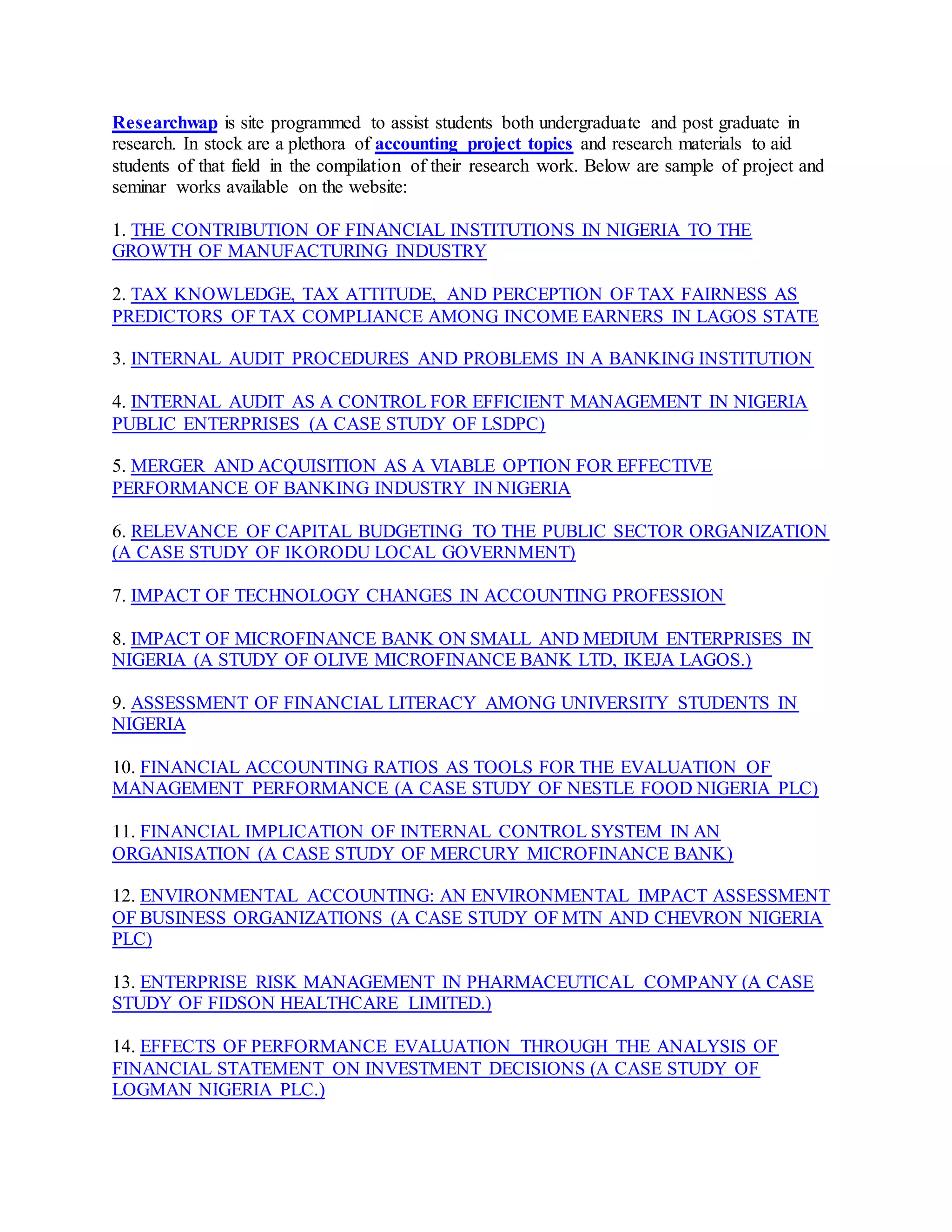 Researchwap is a platform designed to aid both undergraduate and postgraduate students with research in accounting. It offers a wide range of project topics and materials, including studies on financial institutions, tax compliance, internal audit procedures, and more. The site serves as a comprehensive resource for students to access relevant project and seminar works in their field.