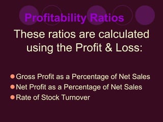 This document discusses various accounting ratios used to evaluate business performance. It describes profitability ratios like gross profit percentage and net profit percentage, which are calculated using the profit and loss statement. It also discusses balance sheet ratios like return on capital invested and current (working capital) ratio, which analyze capital efficiency and liquidity. Specific formulas are provided to calculate each ratio along with guidelines for interpreting the results.