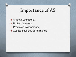 This document provides an overview of several accounting standards including AS 10 on fixed assets, AS 20 on earnings per share, and AS 26 on intangible assets. It discusses the key objectives, applicability, recognition criteria, measurement, and disclosure requirements for accounting and reporting for fixed assets, EPS calculation, and intangible assets according to the relevant accounting standards. The document also covers terminology, components of cost, impairment, amortization, and other accounting treatments for these items to ensure compliance with Indian accounting standards.