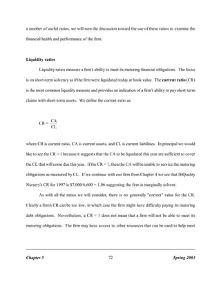 The document discusses various types of financial ratios used to analyze a company's financial statements. It introduces ratio analysis and defines five categories of ratios: liquidity ratios, leverage ratios, repayment capacity ratios, efficiency ratios, and profitability ratios. Specific ratios are then defined within each category. Liquidity ratios like the current ratio and quick ratio measure a company's ability to meet short-term obligations. Leverage ratios like the debt ratio and debt-to-equity ratio indicate the relative proportion of debt and equity used to finance assets. Repayment capacity ratios examine income statement relationships to measure the ability to repay fixed obligations. Efficiency ratios assess how well a company manages its assets, and profitability ratios gauge the ability to generate profits