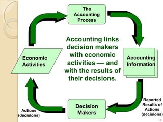 The document provides an overview of accounting information and its role in decision-making, outlining types of accounting, the structure of accounting systems, and the objectives of financial reporting. It highlights the importance of accounting for both external users, such as investors and creditors, and internal users like management, emphasizing the characteristics and timeliness of the information provided. Additionally, it discusses internal control components and the ethical standards necessary in the accounting profession.