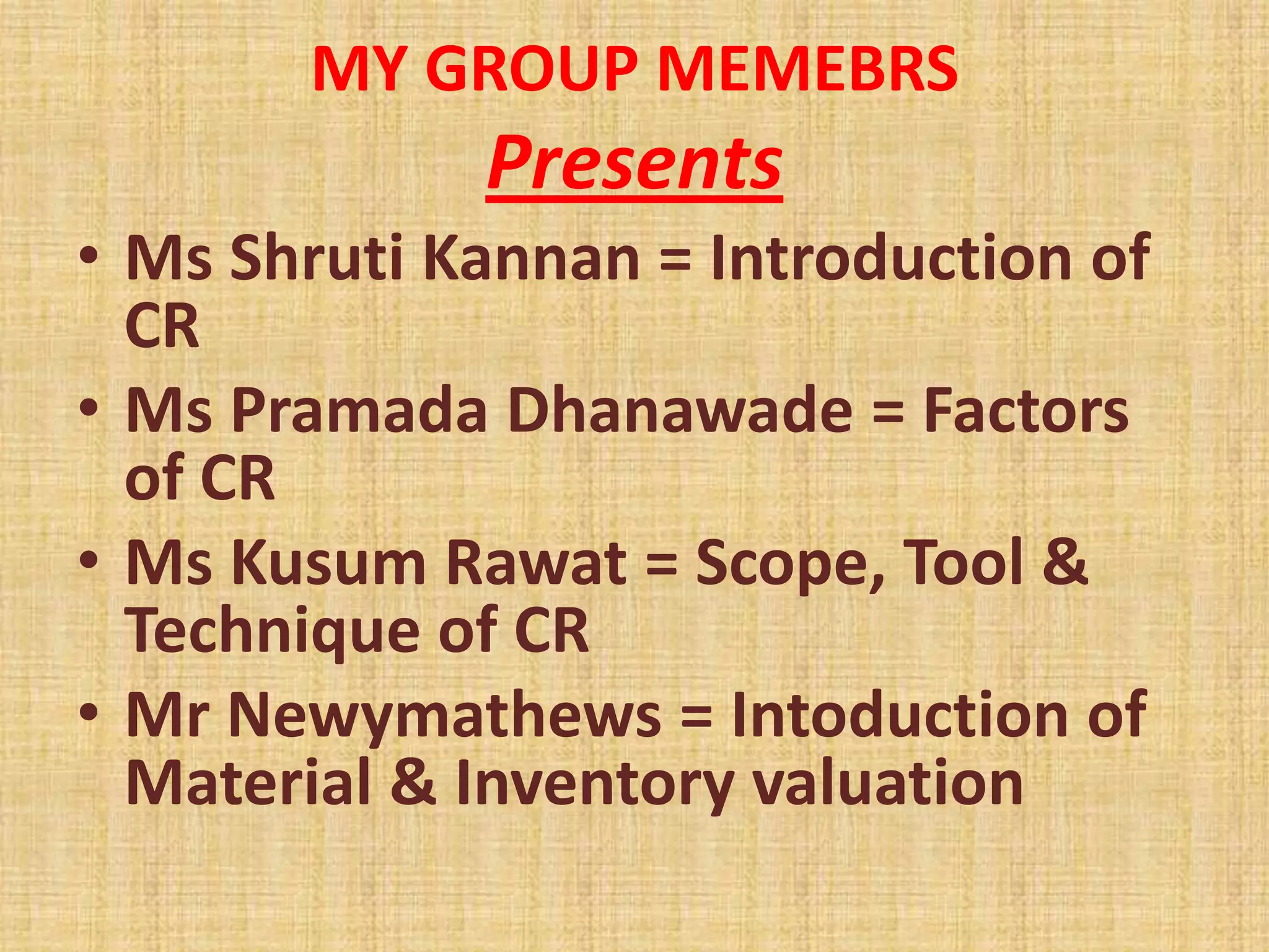 This document discusses overhead costs and their classification. It begins with an introduction of the presenter and group members. It then defines overheads as indirect costs that are not directly identifiable to a specific cost object. It provides examples of direct versus indirect costs. It also classifies overheads based on function (production, administration, selling, distribution) and behavior (variable, fixed, semi-variable). Finally, it outlines the process of allocating and apportioning overheads which involves collecting expenses, departmentalizing, and then allocating or apportioning the expenses among departments.