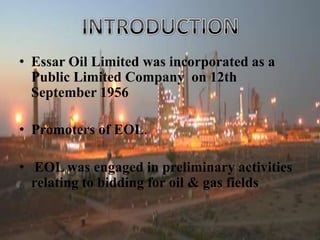 - Essar Oil Limited was incorporated in 1956 and engaged in oil and gas activities. HPCL operates two major refineries in India.