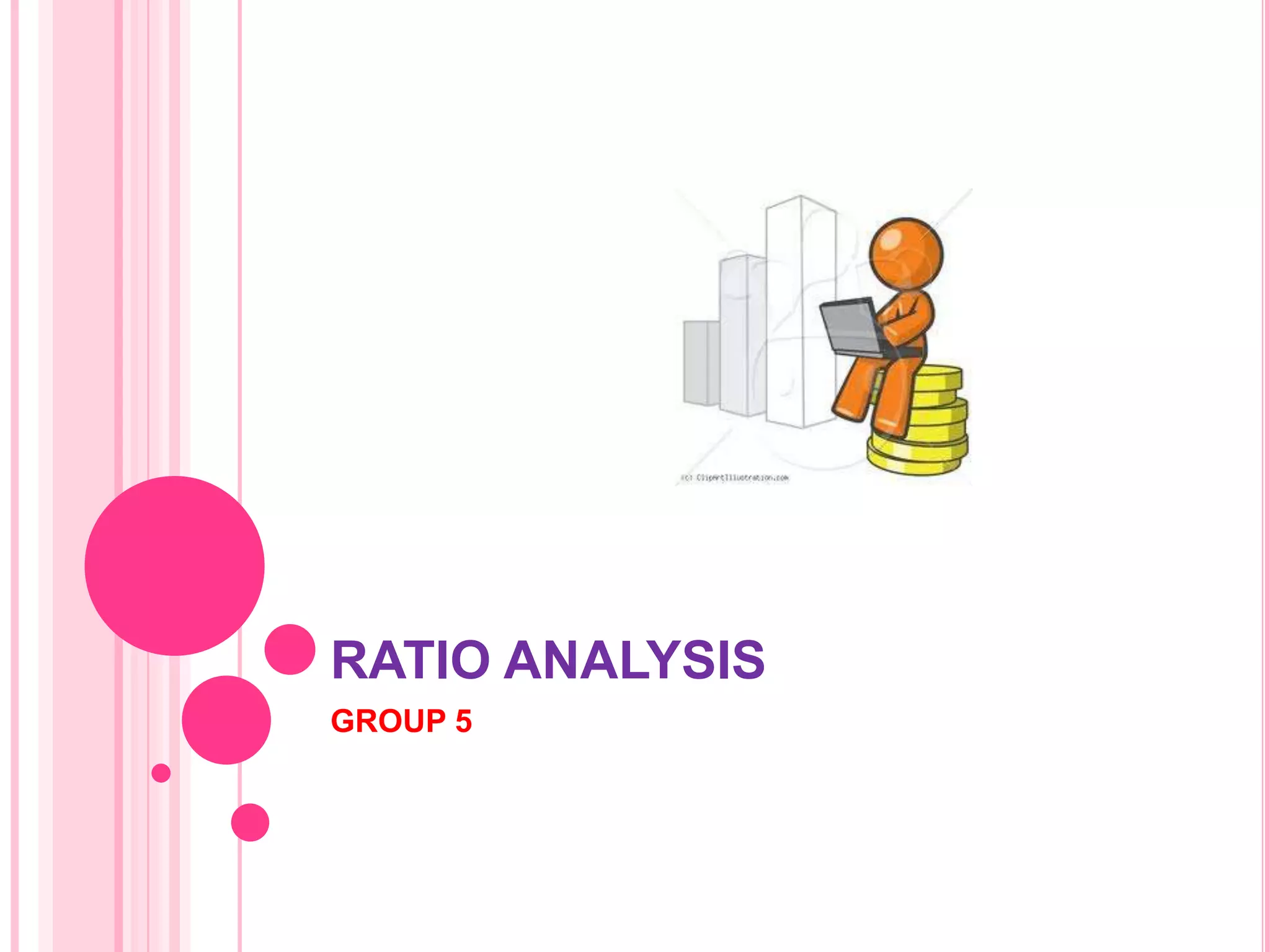 This document defines and discusses various types of ratio analysis used in accounting. It begins by defining a ratio as a mathematical relationship between two quantitative figures. It then outlines the main steps in ratio analysis and some key advantages and limitations. The rest of the document categorizes ratios in several ways: by financial statements, by intended users, by relative importance, and by purpose/function. It provides examples of specific ratios that fall under each of these categories, such as liquidity ratios, profitability ratios, and turnover ratios. The document aims to provide an overview of the different approaches to ratio analysis in accounting.
