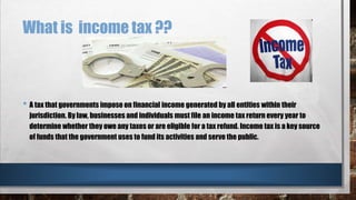 Income tax is a tax imposed by governments on the financial income of entities within their jurisdiction. Individuals and businesses must file annual income tax returns to determine if they owe taxes or are eligible for refunds. Some common income tax scams include generating fake PAN cards and filing fraudulent returns to obtain refunds, as well as misusing sales tax numbers to import goods without paying taxes. It is important for taxpayers to choose reputable tax preparers and to carefully review their returns to avoid being victims of tax fraud.
