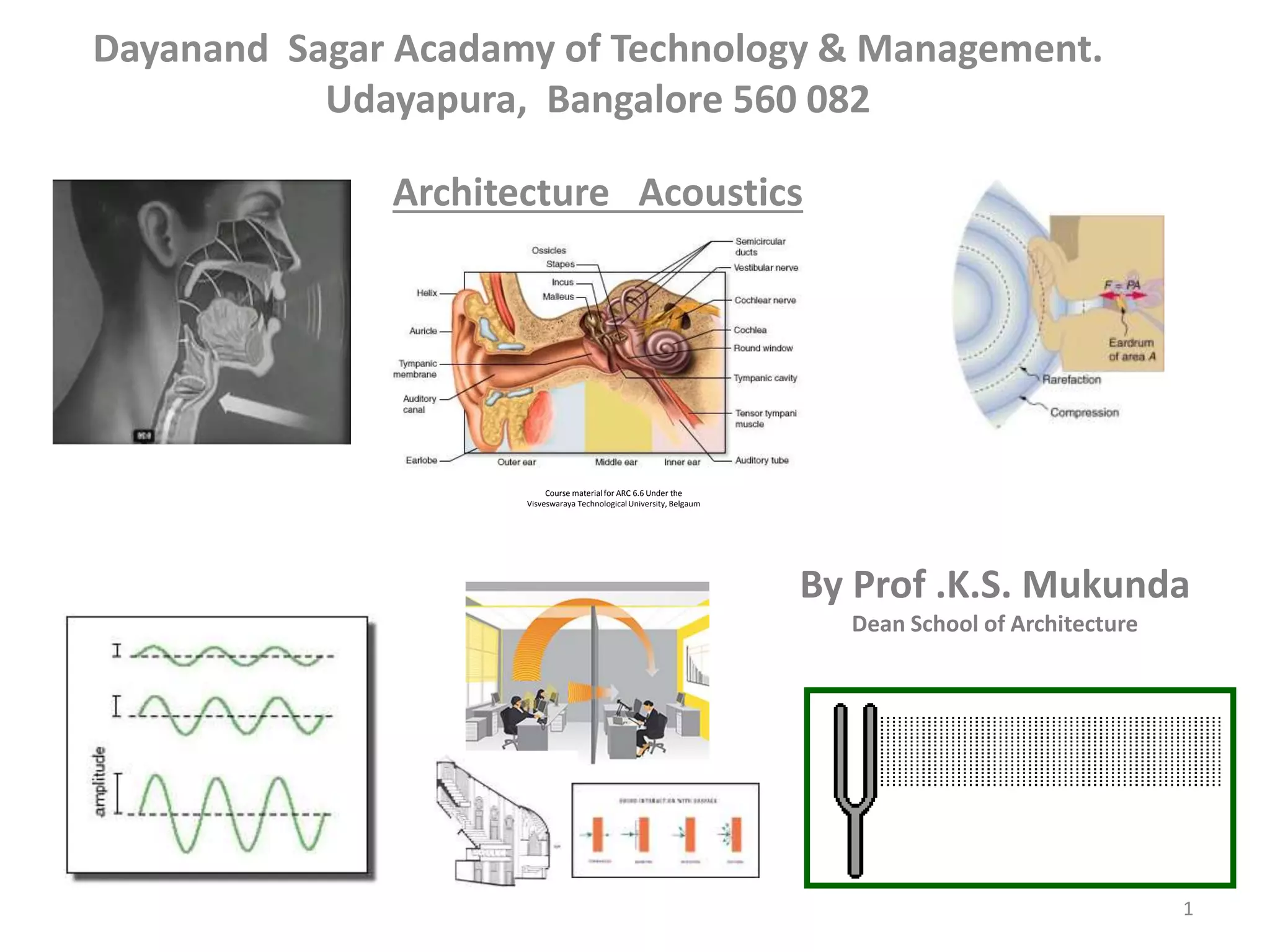 The document outlines the course material for architectural acoustics under Visveswaraya Technological University, highlighting objectives such as understanding acoustics integration in architectural design. It covers topics including room acoustics, sound measurement techniques, means of noise control, and environmental noise management, along with practical applications like multipurpose hall design and studio components. Additionally, it provides definitions and concepts related to sound, enabling students to grasp key principles necessary for acoustical design in various settings.