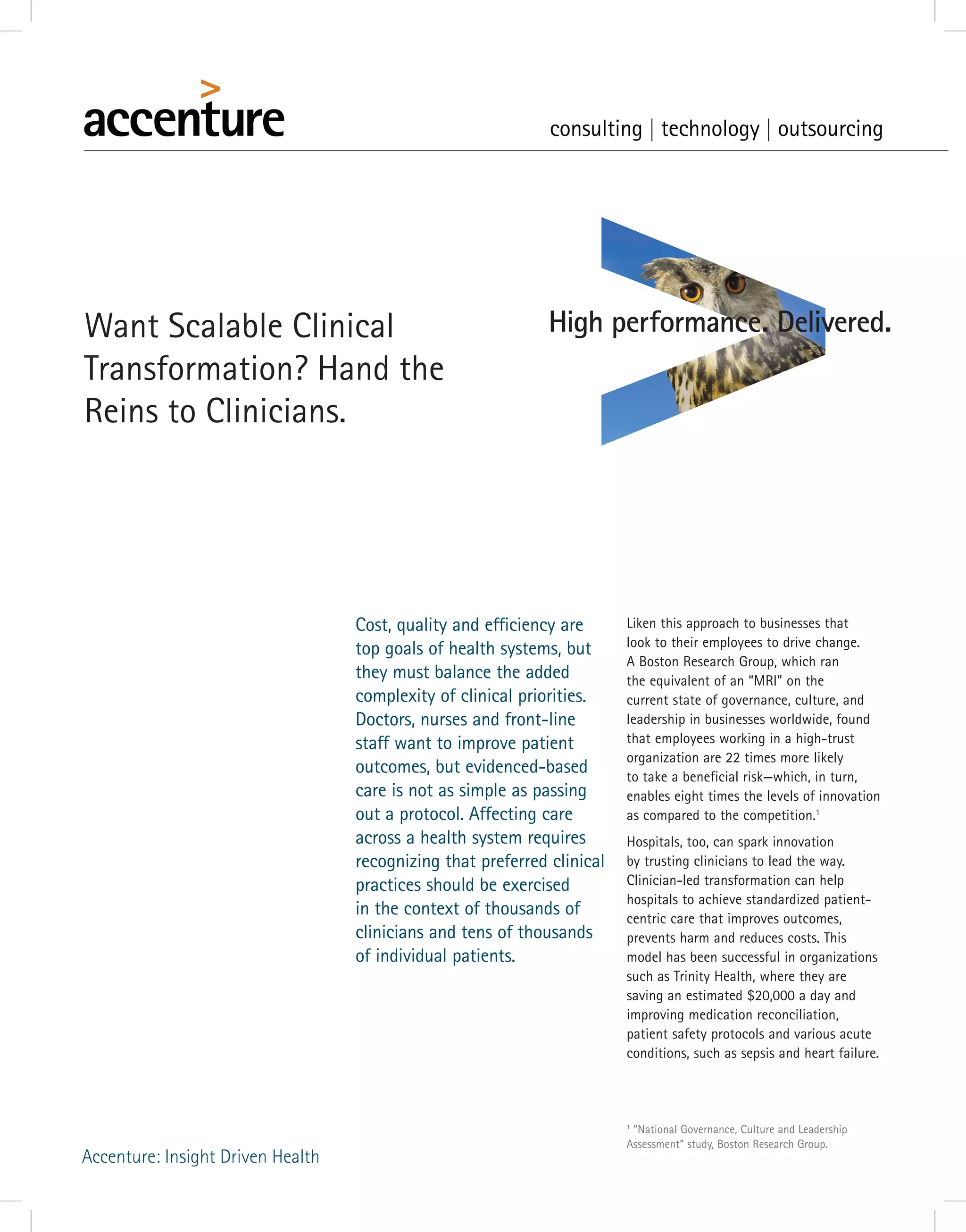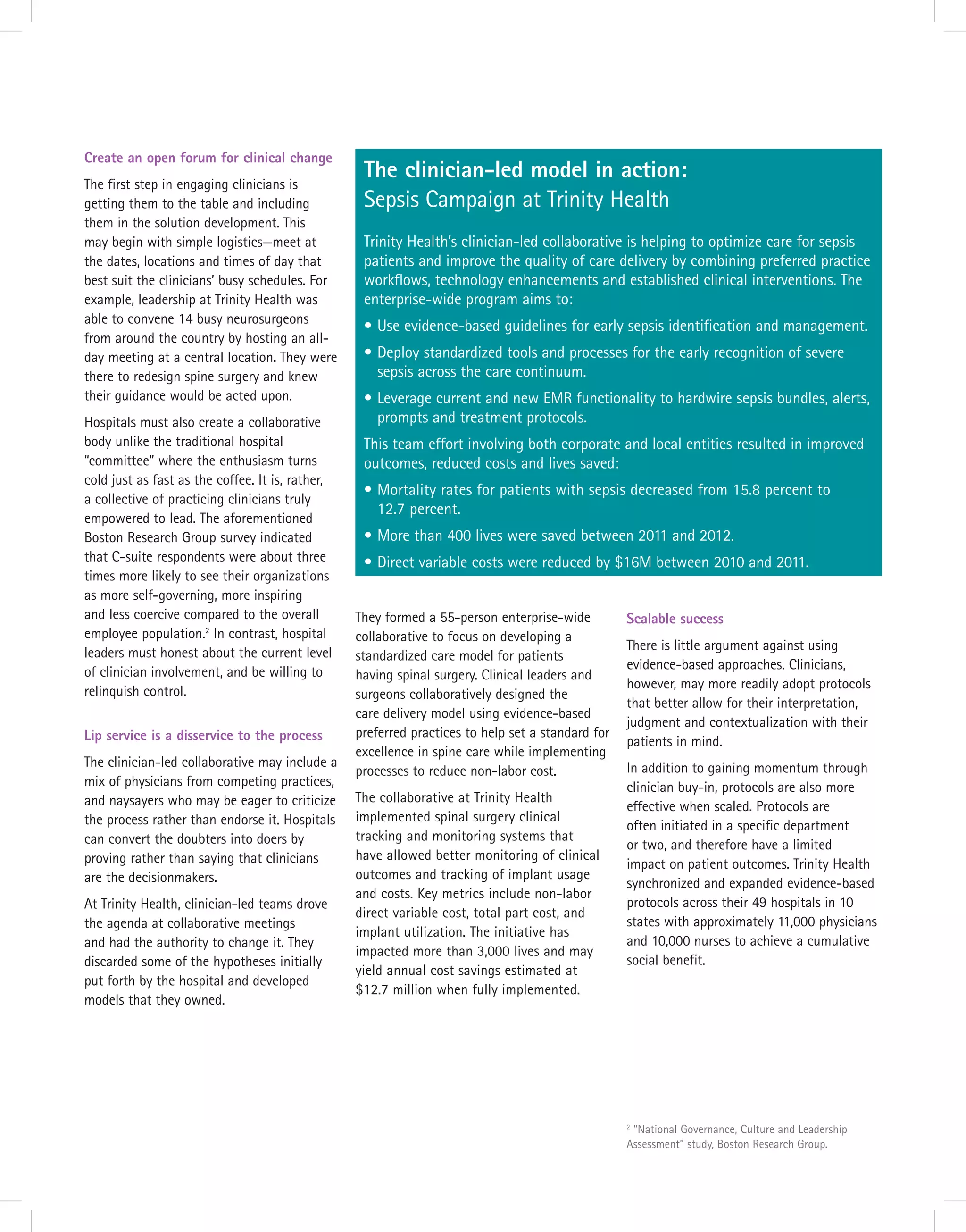 The document discusses how health systems can achieve standardized patient-centric care through clinician-led transformation. It highlights the success of Trinity Health in saving $20,000 per day and improving outcomes by empowering clinicians to lead collaborative efforts to develop and implement evidence-based standardized care protocols and monitor their impact. Key aspects that contributed to Trinity Health's success include creating an open forum for clinicians to develop solutions, proving rather than just stating that clinicians are decision-makers, using data to prioritize opportunities, and establishing rigorous project management and measurement of results.