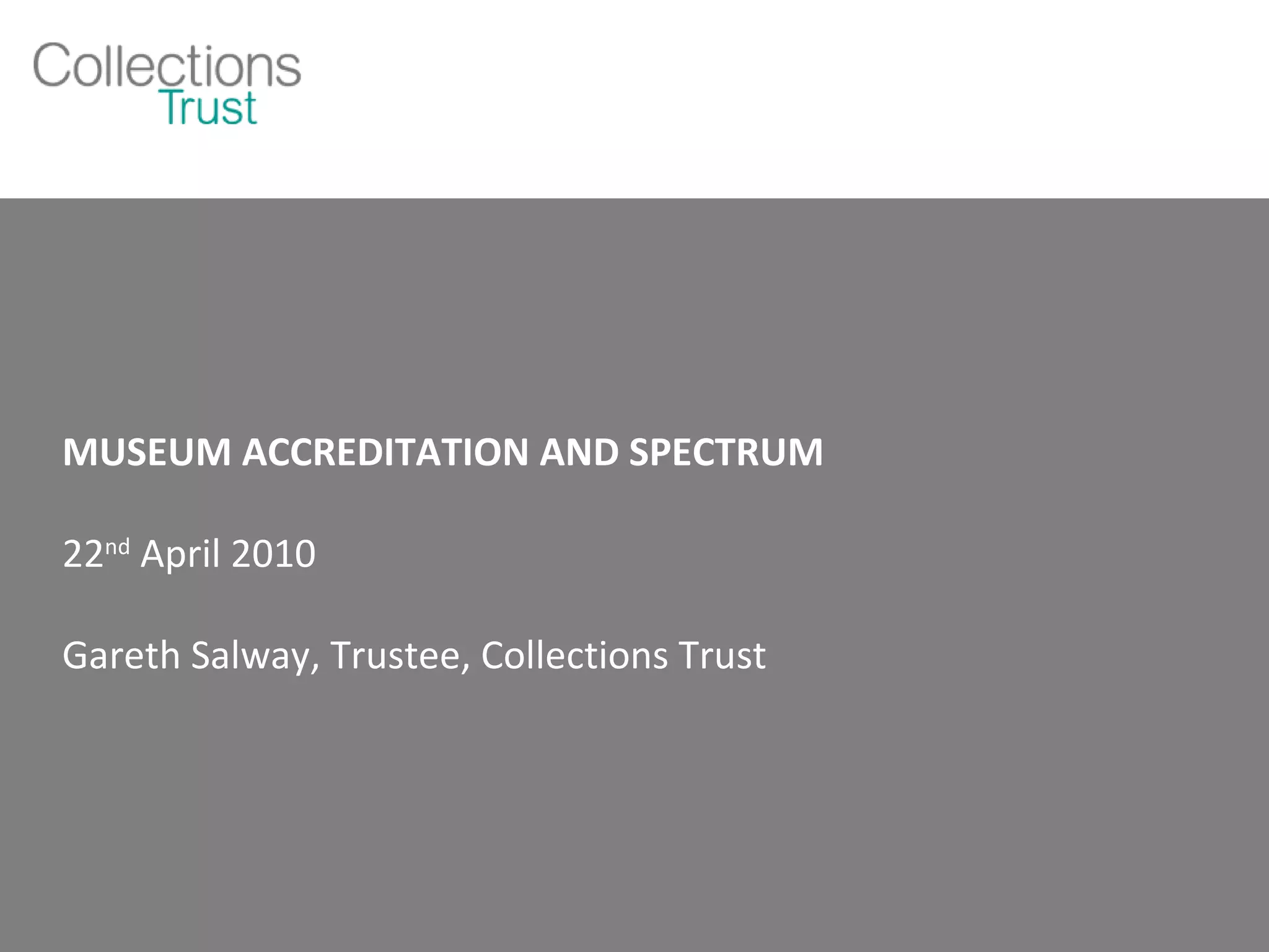 The document discusses the evolution and future of museum accreditation and the Collections Trust's role in this process, emphasizing the importance of public access to collections and the need for museums to integrate collections management with organizational planning. As the accreditation scheme is reviewed, there is a focus on reducing bureaucracy, utilizing technology, and creating a more interactive and holistic approach to managing collections. The introduction of Spectrum 4.0 marks a shift towards an international standard with an emphasis on simplifying procedures and enhancing connections between collections and user needs.