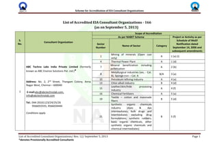 This document lists 166 accredited EIA consultant organizations in India as of September 5, 2013. It provides details of each organization such as their name, address, contact information, and scope of accreditation based on the sectors and projects types they are approved to work on according to the National Accreditation Board for Education and Training (NABET) scheme. The sectors range from mining and minerals to industries like thermal power plants, cement, textiles, and chemicals. Some organizations have conditional or provisional accreditation.