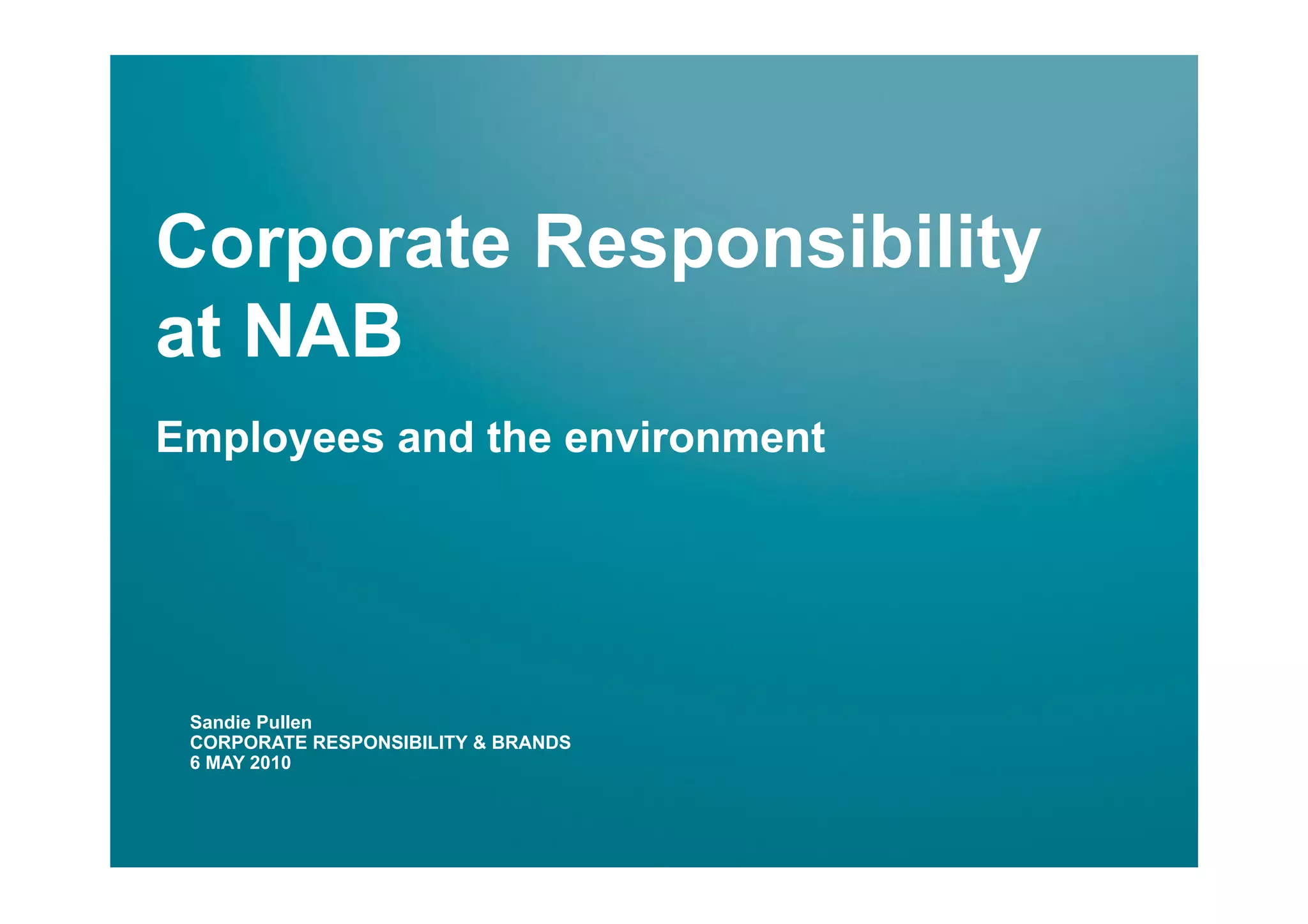 This document discusses NAB's corporate responsibility efforts, with a focus on environmental initiatives. It describes NAB's definition of corporate responsibility as doing business in a way that considers stakeholders and long-term economic, social, and environmental impacts. It outlines NAB's core commitments to customers, employees, society, and the environment. The document then focuses on NAB's efforts to engage employees in environmental sustainability, including establishing a green team community, initiatives to reduce the company's carbon footprint and employees' impacts, and efforts to monitor awareness and engagement like an annual survey. It provides lessons learned around dedicating resources, effective communication, and recognizing employee contributions.