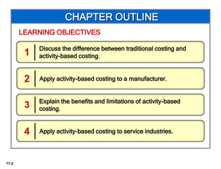 2) The document provides an example of applying activity-based costing to Atlas Company, identifying activities, cost pools, cost drivers, and allocating overhead costs across four steps.