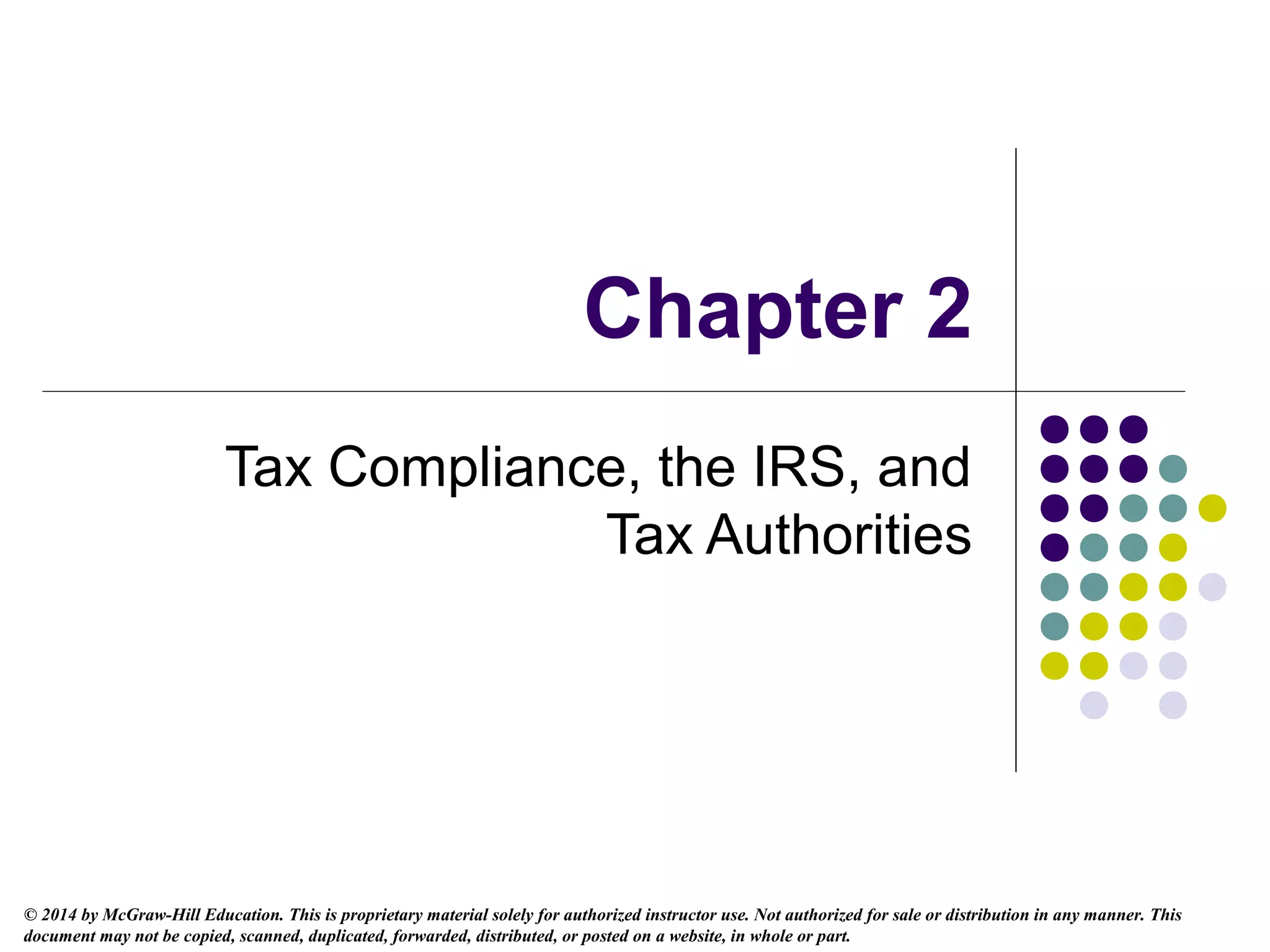 This chapter discusses tax compliance and the responsibilities of taxpayers and tax professionals. It covers filing requirements, statutes of limitations, the IRS audit process, tax law sources such as statutes and judicial rulings, tax research procedures, and penalties for noncompliance. The key aspects are requirements to file income tax returns, how the IRS selects returns for audit, the hierarchy of primary and secondary tax authorities, and the potential penalties for taxpayers and tax professionals.