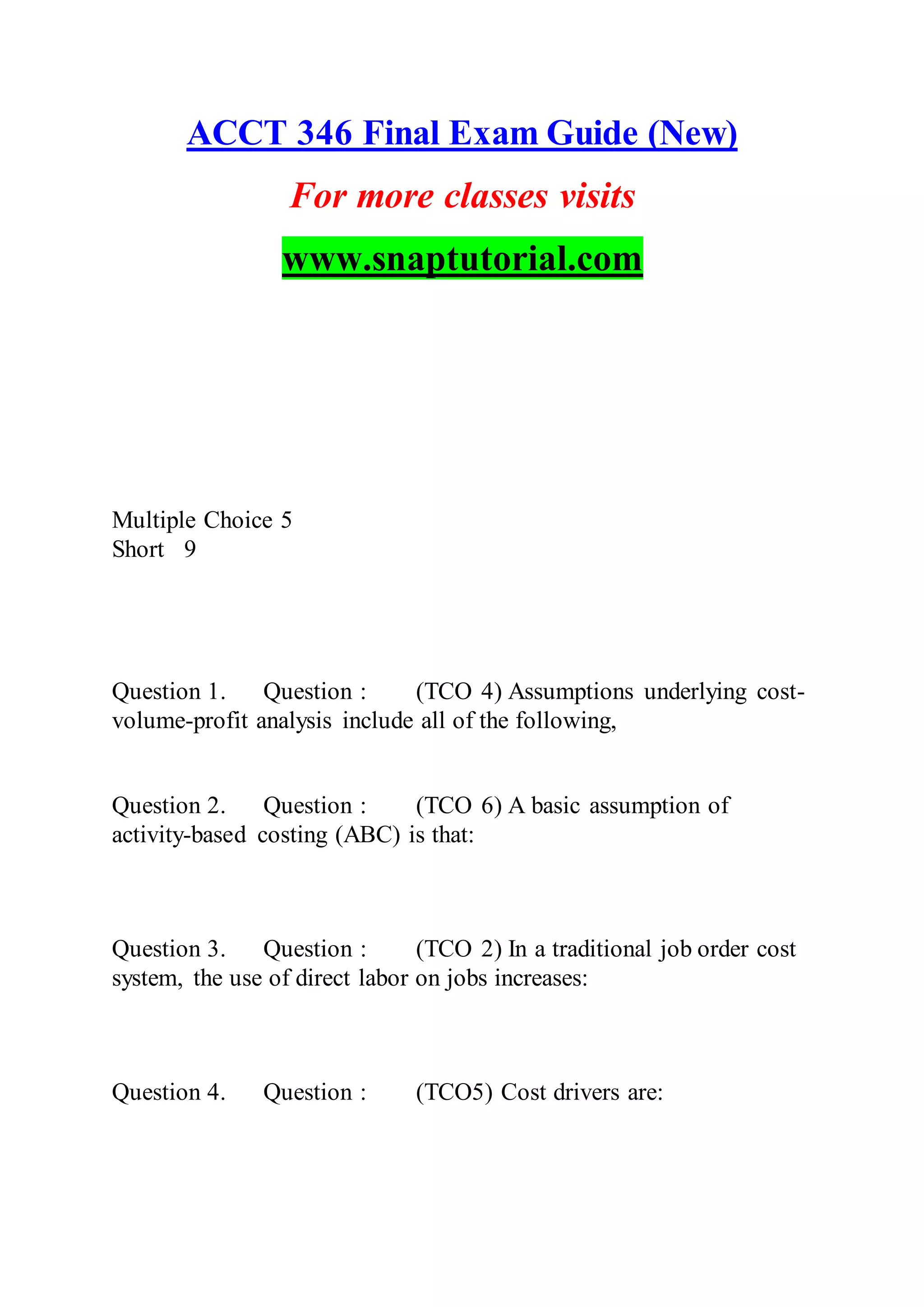 The document outlines a comprehensive guide and exam materials for an Accounting course, including multiple-choice questions, problem-solving scenarios, and managerial accounting concepts. It covers various topics such as cost-volume-profit analysis, activity-based costing, and job order costing, along with practical applications related to financial decision-making in hypothetical situations. Additionally, it provides information about project deliverables and grading criteria throughout the course.