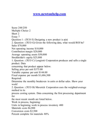 The document contains detailed course materials and assessments for ACCT 505, covering topics such as job order and process costing, performance measurement, capital budgeting, and cash budgeting. It includes various quizzes, case studies, and exam guides for multiple weeks, along with exercises requiring calculations of ROI, breakeven points, and cost analysis. Additionally, there are practical scenarios involving make-or-buy decisions and flexible budget analysis.