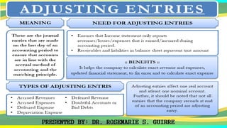 This document provides an overview of adjusting entries in accounting. It discusses five categories of adjusting entries: 1) Prepaid expenses where assets are adjusted as expenses are used up, 2) Depreciation of plant assets where asset costs are allocated to expenses over time, 3) Accrued expenses where expenses incurred but not paid are recorded, 4) Accrued revenues where revenues earned but not received are recorded, and 5) Unearned revenue where cash received before work is done creates a liability. Examples are provided for each category to illustrate the adjusting journal entries. The purpose of adjusting entries is to allocate revenues and expenses to the proper accounting periods.