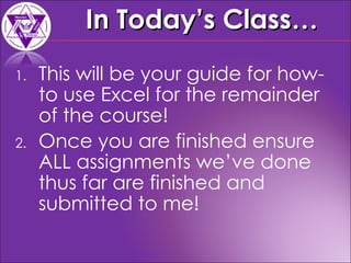 This document provides an introduction to using Microsoft Excel for an accounting course. It explains basic spreadsheet concepts and Excel features such as cells, columns, rows, formatting, entering data, altering cell sizes, inserting/deleting rows and columns, and using cut, copy and paste. Students are instructed to create a proper spreadsheet for accounting purposes based on a provided guide.