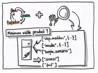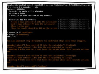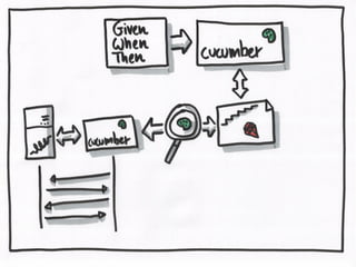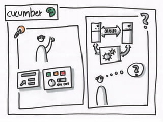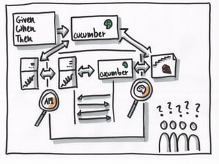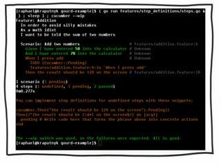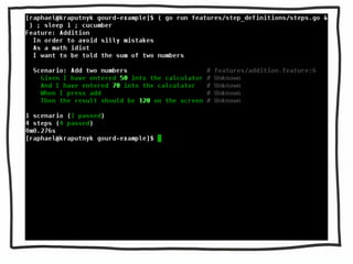 This document describes using Cucumber to test a simple calculator application written in Go. It includes code snippets for defining calculator functionality, Cucumber step definitions to test adding two numbers, and links to resources about test-driven development.