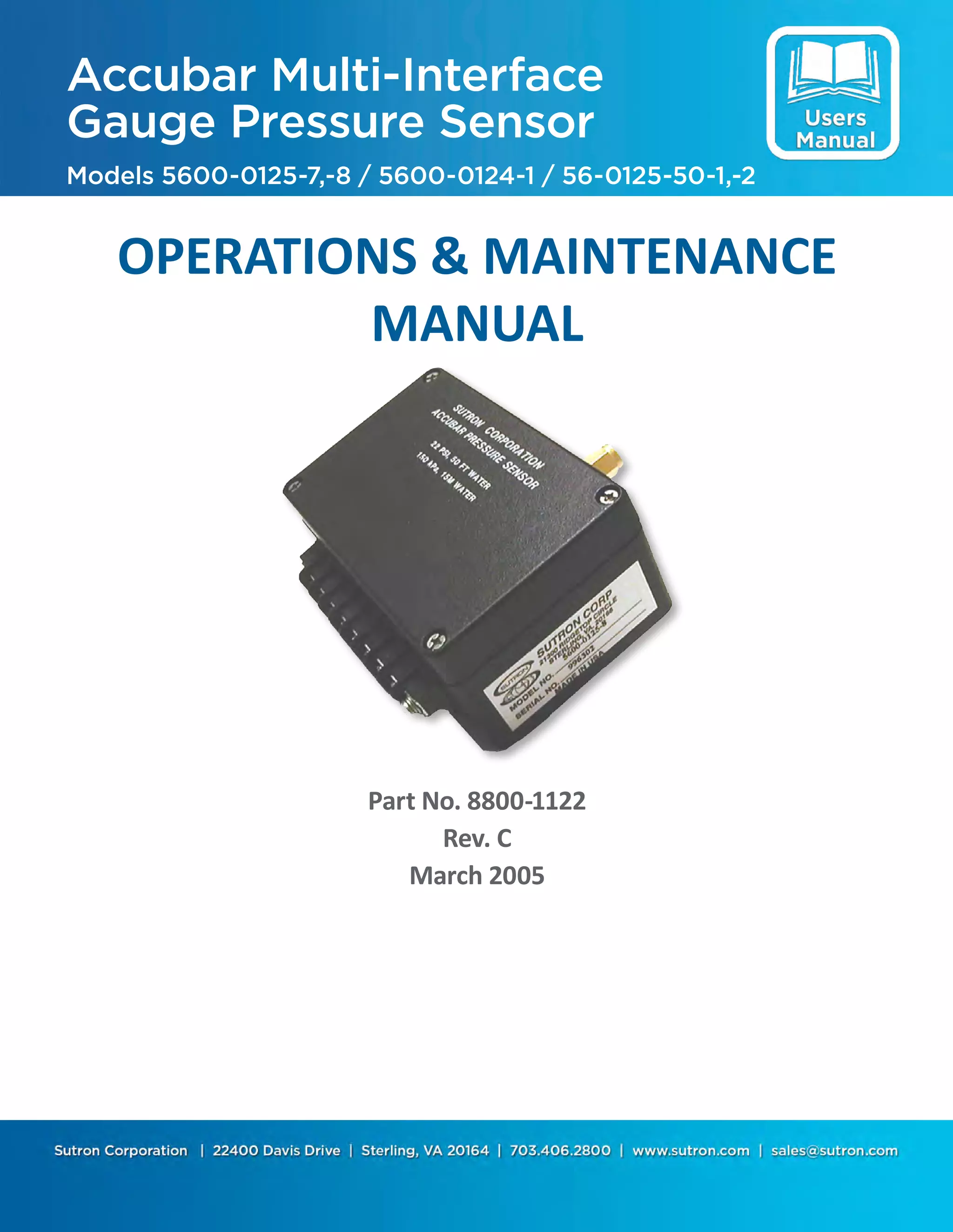 The Accubar gauge pressure sensor manual outlines the setup, operation, cabling, and maintenance of various models including 5600-0125-7, 5600-0124-1, and 56-0125-50-1. It provides detailed instructions on wiring configurations, command references, and sensor features like low power consumption and high accuracy. Additionally, the document includes troubleshooting tips and specifications for each model.
