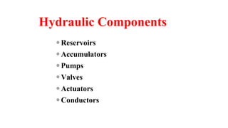 This document discusses hydraulic accumulator components. It describes different types of accumulators including spring loaded, gas charged, weight loaded, and hydraulically counter loaded. Spring loaded accumulators can use sealed pistons, compound springs, diaphragms, or springs with bellows. Gas charged accumulators commonly use nitrogen and can have bladder, diaphragm, sealed piston, or metal bellows designs. The accumulators store energy, stabilize pump pulsation and load shocks, and store volume under pressure for high demands.
