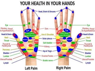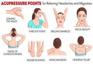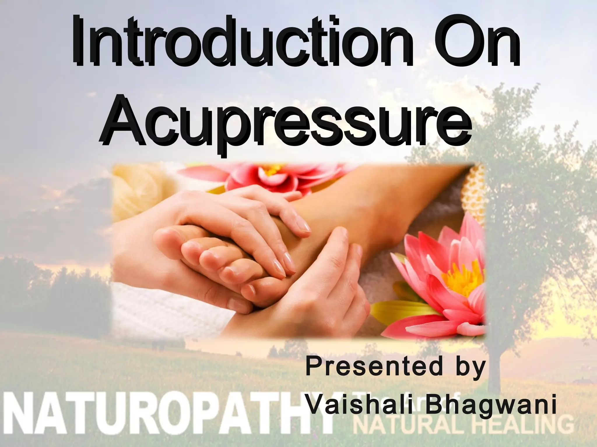 This document provides an overview of acupressure as a method of naturopathy. It defines acupressure as an ancient healing technique that uses finger pressure on key points of the body to stimulate the body's natural healing abilities. The document outlines the principles of naturopathy, then describes the history of acupressure, how it works by applying pressure to points along meridian lines, its classification into different therapies, advantages like being drug-free and easy to learn, potential disadvantages like not treating all conditions, and applications for ailments like headaches, cramps, and nausea.