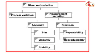 Accuracy refers to how close a measured value is to the actual true value, while precision refers to how close repeated measurements are to each other. A measurement can be precise but not accurate if measurements are clustered but not near the true value, or accurate but not precise if measurements are scattered but the average is near the true value. Factors that affect accuracy include calibration standards, the workpiece being measured, measuring instruments, the person performing measurements, and environmental conditions.