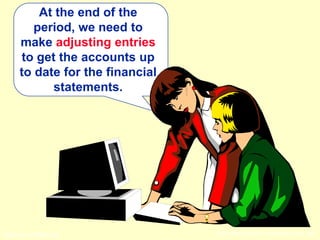 Adjusting entries are made at the end of an accounting period to properly record revenues and expenses that relate to multiple periods. There are four main types of adjusting entries:
