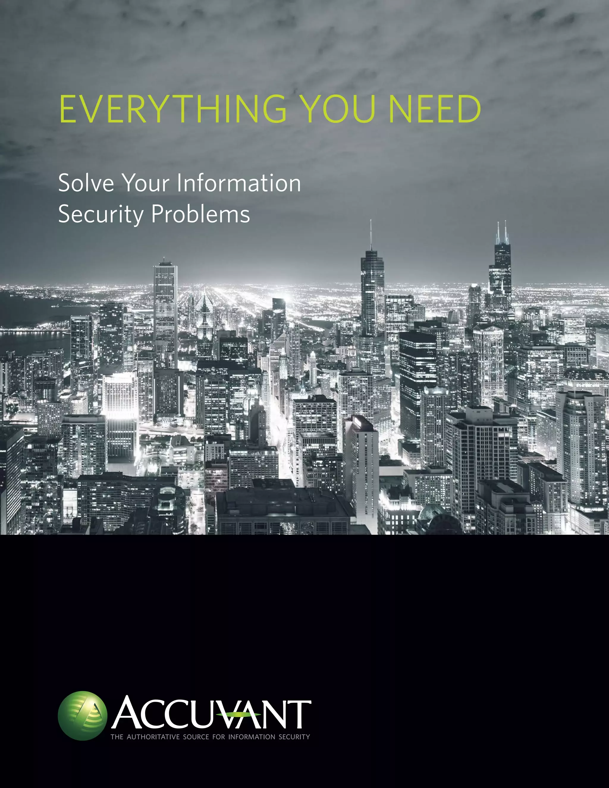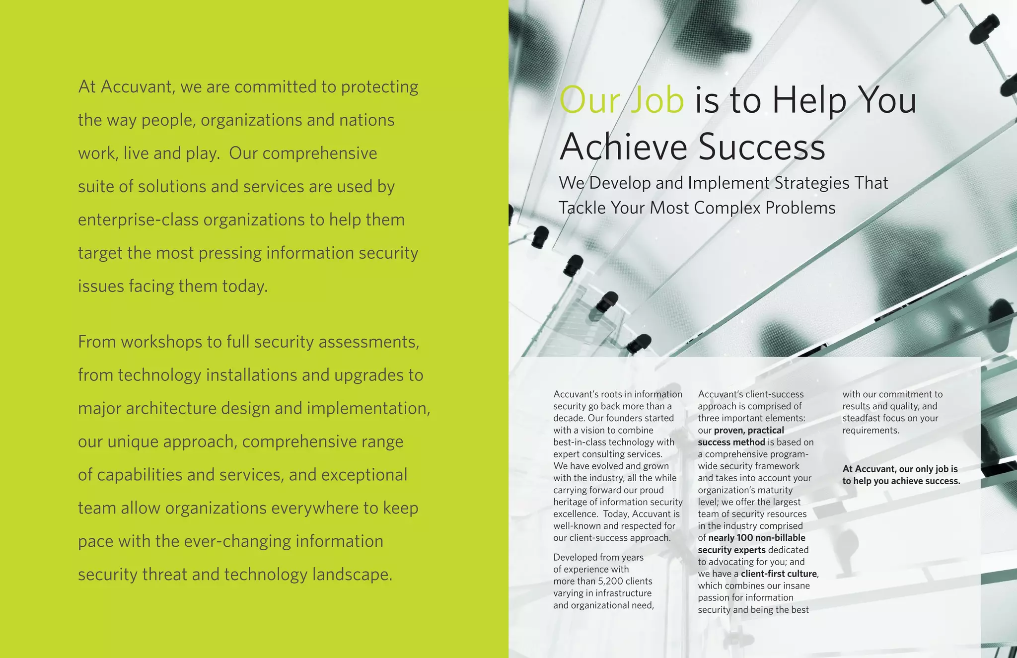 Accuvant is a cybersecurity firm that provides a comprehensive suite of security solutions and services to help organizations address pressing security issues. Their unique approach combines best-in-class technology with expert consulting services. They have a team of over 250 security experts called Accuvant LABS who perform research, develop solutions, and work with clients. Accuvant's services include security assessments, technology installations, managed security services, training, and consulting to help organizations secure their infrastructure and achieve security goals.