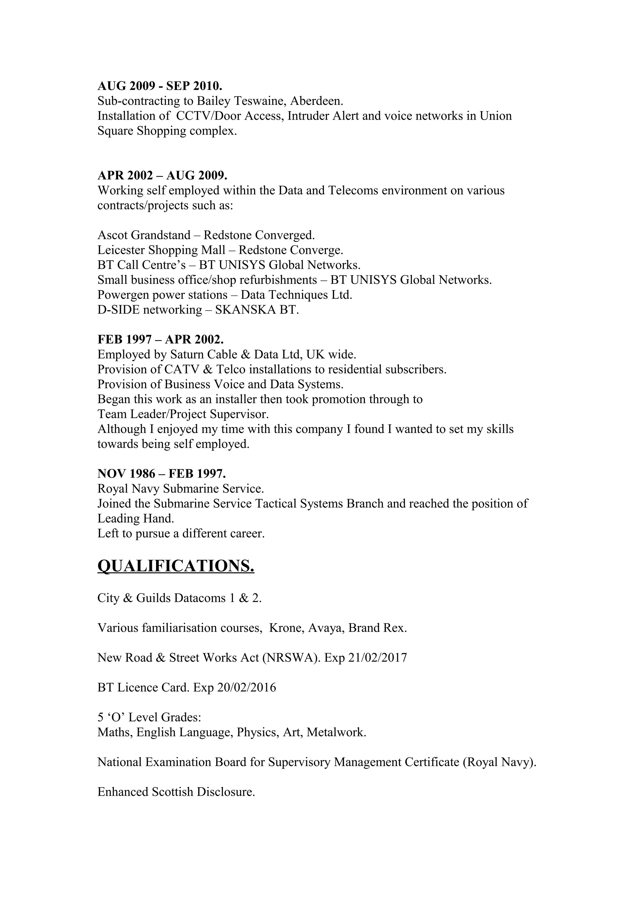 Andrew Campbell is a data/telecoms engineer living in Broughty Ferry, Dundee with over 30 years of experience. He has held various roles including working directly for BT Openreach and as a subcontractor for several telecommunications companies. He has extensive accreditations and qualifications in copper jointing, fiber installation, structured cabling, and audio/visual systems.