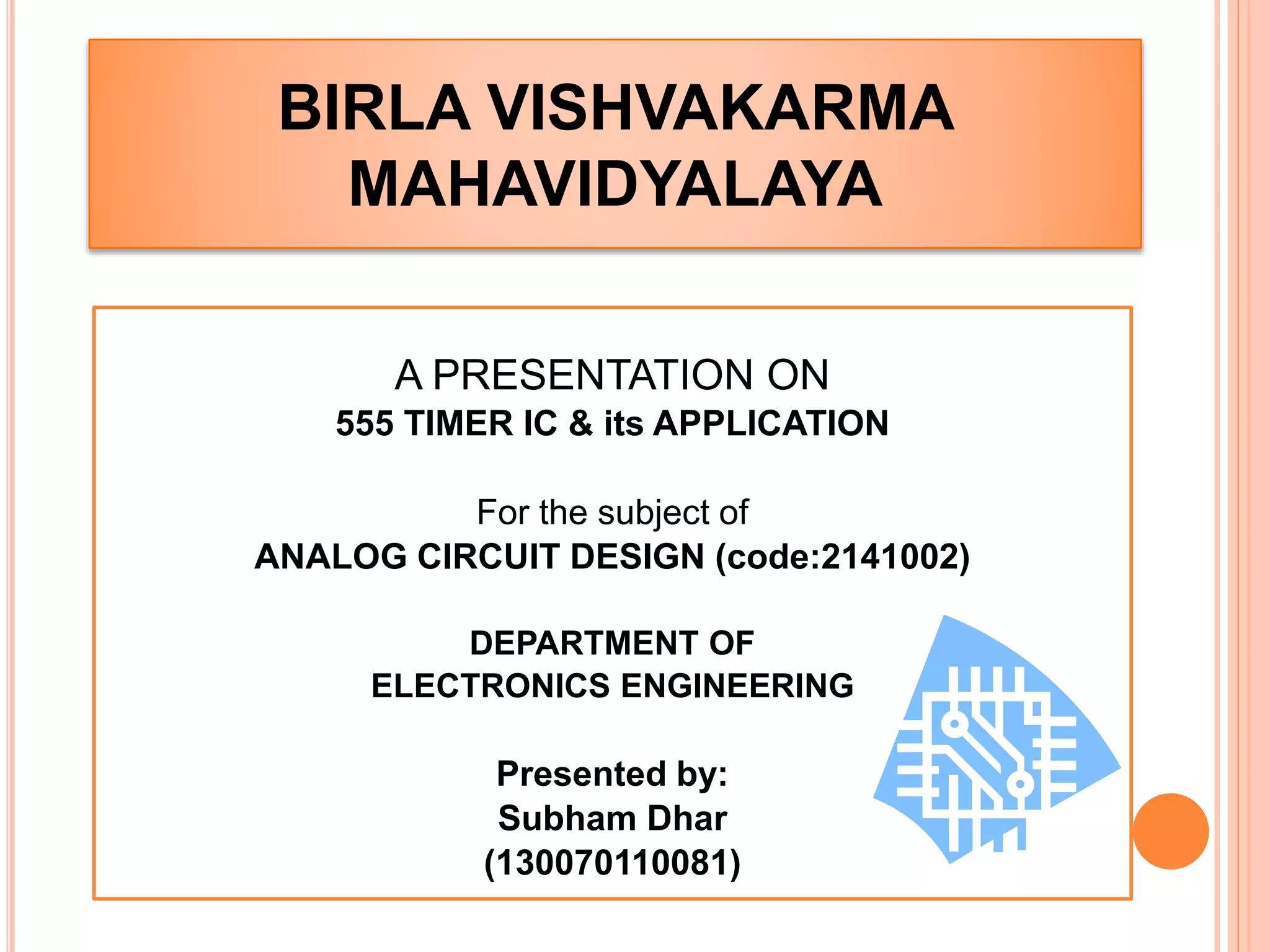 This presentation discusses the 555 timer IC and its applications in analog circuit design. It begins by describing the basic building blocks of the 555 timer IC, which include an RS flip-flop, two comparators, a reference voltage source, and a discharge transistor. It then shows how the 555 timer can be configured as a monostable and astable multivibrator. Diagrams illustrate the voltage levels and switching in each configuration. Sample waveforms are displayed and the operations of the astable timer circuit are explained in steps. Applications for a square wave oscillator and clock circuit using the 555 timer IC are also presented.