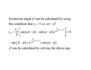 The document discusses different types of phase controlled rectifiers. There are two types - single-phase and three-phase controlled rectifiers. Single-phase rectifiers can be half-wave or full-wave, while three-phase rectifiers can be semi, full, or dual converters. The operation of a single-phase half-wave thyristor converter with a resistive load is explained, including derivations of average output voltage, RMS output voltage, and load current. Effects of an inductive load are also discussed.