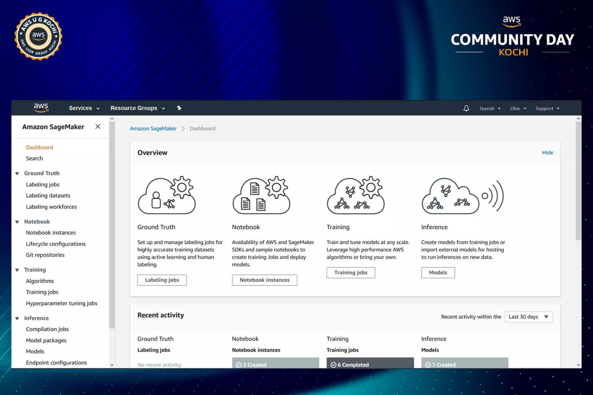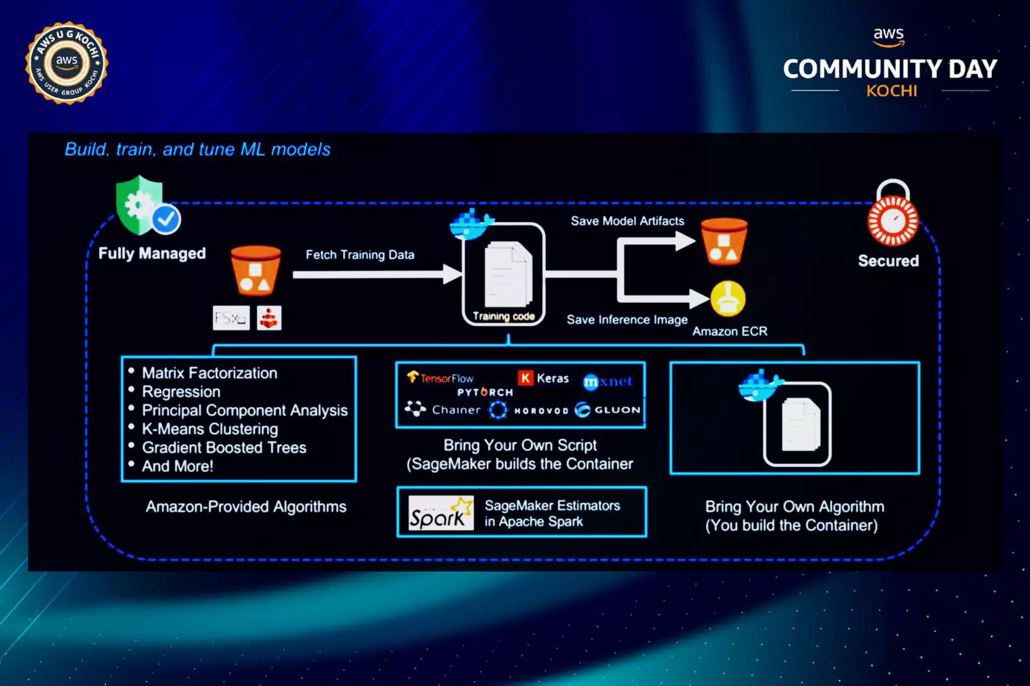 The document discusses Amazon SageMaker, a fully managed machine learning service that simplifies the machine learning process from building to deployment. It highlights features such as auto-scaling, one-click deployment, and support for custom algorithms, as well as various tools for data processing, model training, and optimization. Additionally, it addresses security measures and cost-saving options like managed spot training to enhance machine learning operations on AWS.