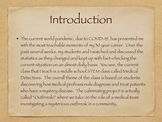 This document outlines a proposed 8-day unit for a middle school STEM class called Medical Detectives about COVID-19. The unit aims to take advantage of students' interest in the current pandemic. It incorporates authentic learning experiences like a guest speaker from healthcare and activities like diagnosing simulated patient cases. Students work in groups to research COVID-19 and other illnesses, then create and present educational materials on the virus. Formative and summative assessments gauge learning. The goal is to use students' real-world experiences and knowledge of the pandemic to teach science concepts in a meaningful way.