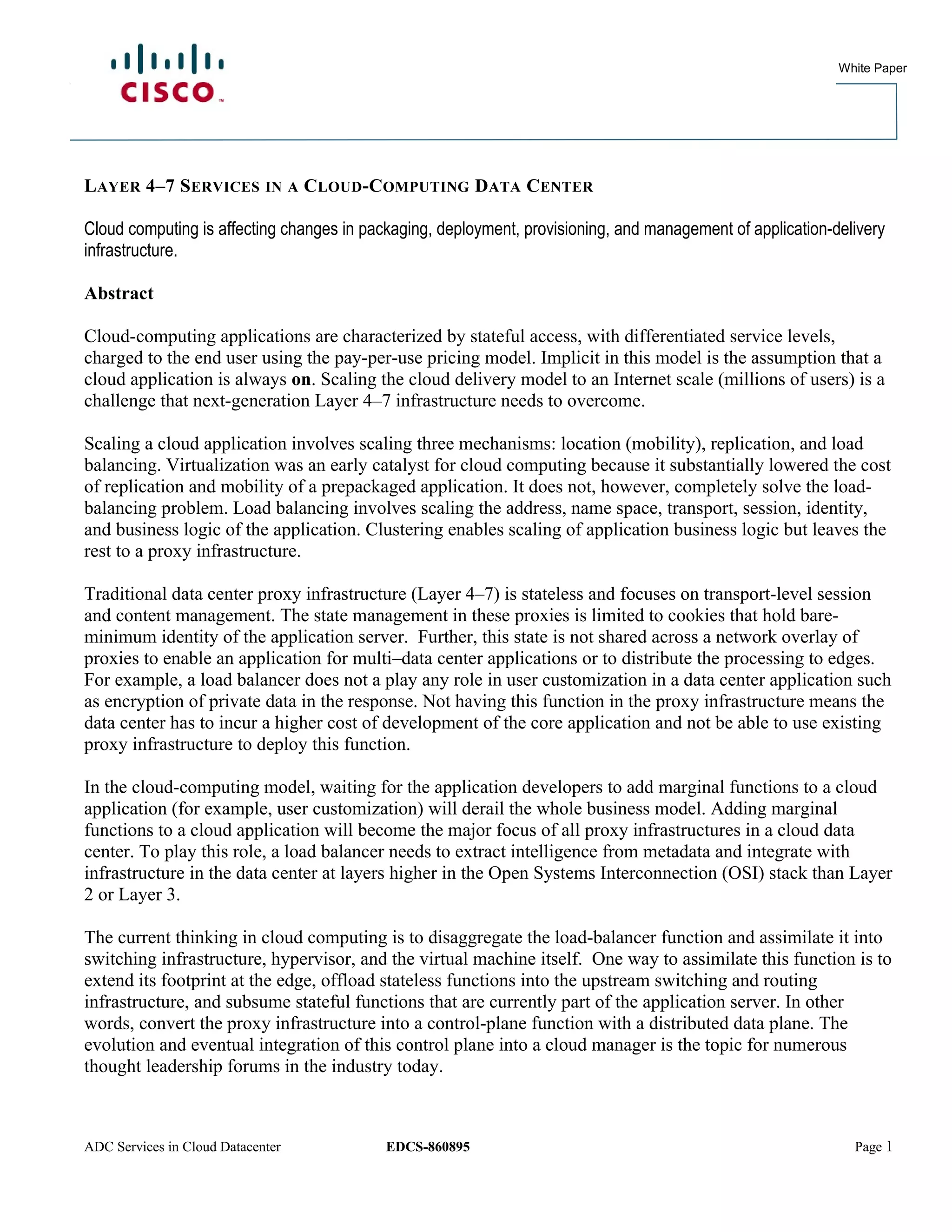 This white paper discusses the impact of cloud computing on application delivery infrastructure, highlighting challenges in scaling cloud applications and the evolving role of layer 4–7 services. It contrasts traditional data center architecture with cloud data centers, emphasizing the need for enhanced scalability and state management in a cloud environment. The document also outlines the significance of disaggregating load-balancer functionality and integrating it into data center infrastructure to support the demands of cloud applications.